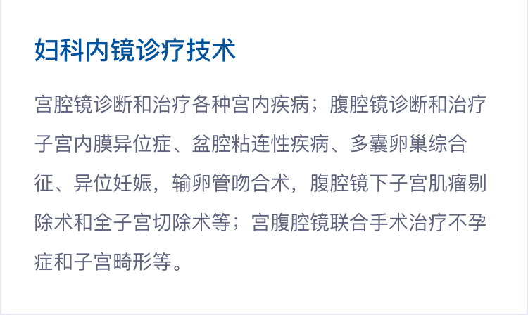 宫腔镜诊断和治疗各种宫内疾病;腹腔镜诊断和治疗子宫内膜异位症、盆腔粘连性疾病、多囊卵巢综合征、异位妊娠,输卵管吻合术,腹腔镜下子宫肌瘤剔除术和全子宫切除术等;宫腹腔镜联合手术治疗不孕症和子宫畸形等。