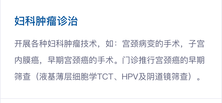 开展妇科肿瘤的常规诊断何治疗技术,如:宫颈病变的手术,子宫内膜癌,早期宫颈癌的手术。门诊开展宫颈癌的早期筛查(液基薄层细胞学TCT、HPV及阴道镜筛查)。