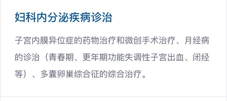 子宫内膜异位症的药物治疗和微创手术治疗、月经病的诊治(青春期、更年期功能失调性子宫出血、闭经等)、多囊卵巢综合征的综合治疗
