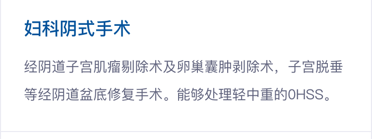 经阴道子宫肌瘤剔除术及卵巢囊肿剥除术,子宫脱垂等经阴道盆底修复手术。能够处理轻中重的OHSS