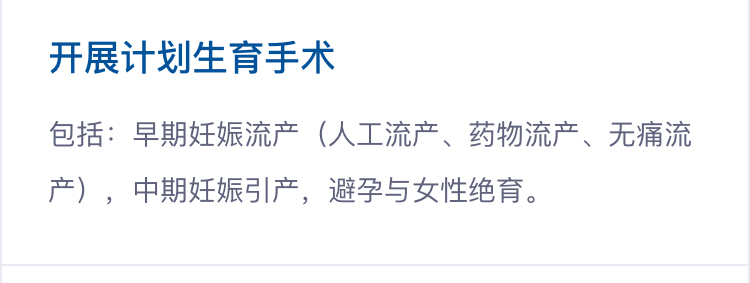 包括:早期妊娠流产(人工流产、药物流产、无痛流产),中期妊娠引产,避孕与女性绝育。