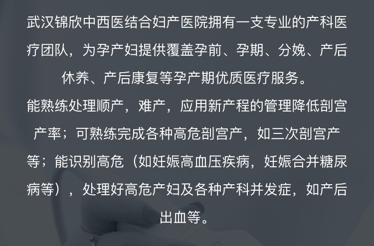 武汉锦欣中西医结合妇产医院拥有一支产科队伍,为孕妇提供覆盖孕前、分娩、产后修养、产后康复等孕产期服务。能熟练处理顺产,难产,应用新产程的管理降低剖宫产率;可熟练完成各种高危剖宫产,如:三次剖宫产等;能识别高危(如妊娠高血压疾病,妊娠合并糖尿病等),处理好高危产妇及各种产科并发症,如产后出血等。