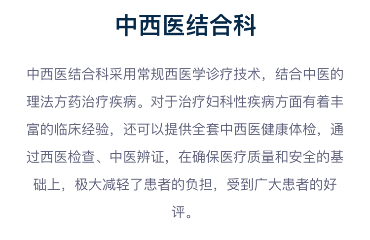 中西医结合采用常规西医学诊疗技术,结合中医的理法方药治疗疾病。对于治疗妇科性疾病方面有着丰富的临床经验,还可以提供全套中西医健康体检,通过西医检查、中医辩证,受到广大患者的好评。